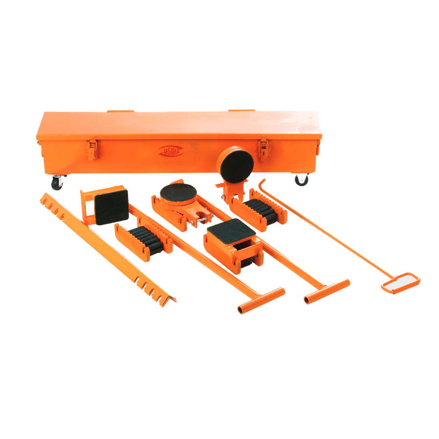 El kit de tanquetas JAGUAR se compone de 4 tanquetas de rodillos metálicos (2 con placa fija y 2 con placa giratoria), 2 palancas de tiro, 2 barras de unión, y 1 caja metálica con su palanca de tiro que sirve tanto para el transporte como para el guardado del kit.