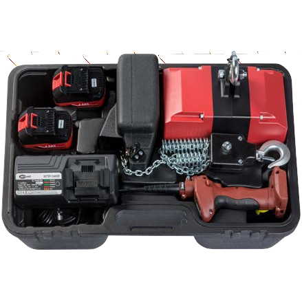 Polipasto de Cadena portable, funcionando a batería de fabricación europea, ideal para trabajos fuera del taller, incluye maletín de transporte.