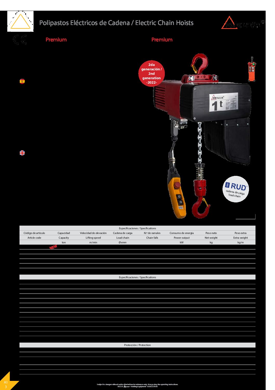Polipasto eléctrico de cadena de fabricación europea, fabricado por la multinacional DELTA para Ibérica del cable y elevación.